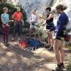 Nach einer ereignisreichen Woche an den unterschiedlichen Felsen der Region bei strahlendem Sonnenschein ließ uns das Wetter am Samstag dann leider im Stich: Schon in der Nacht hatte es angefangen zu regnen und dieser hielt auch über den ganzen Tag an, so dass das Ausbilder*innenteam die verbleibenden theoretischen Themenpunkte kurzerhand auf die Terrasse ihres Bungalows verlegten. Dort wurden abschließend die Ein-Mann-Bergung, Seilverlängerung von oben und noch etwas Materialkunde vermittelt. Am Tagesende waren wir alle froh, dass der Balken des Terrassendachs stabil genug war und uns gehalten hat.