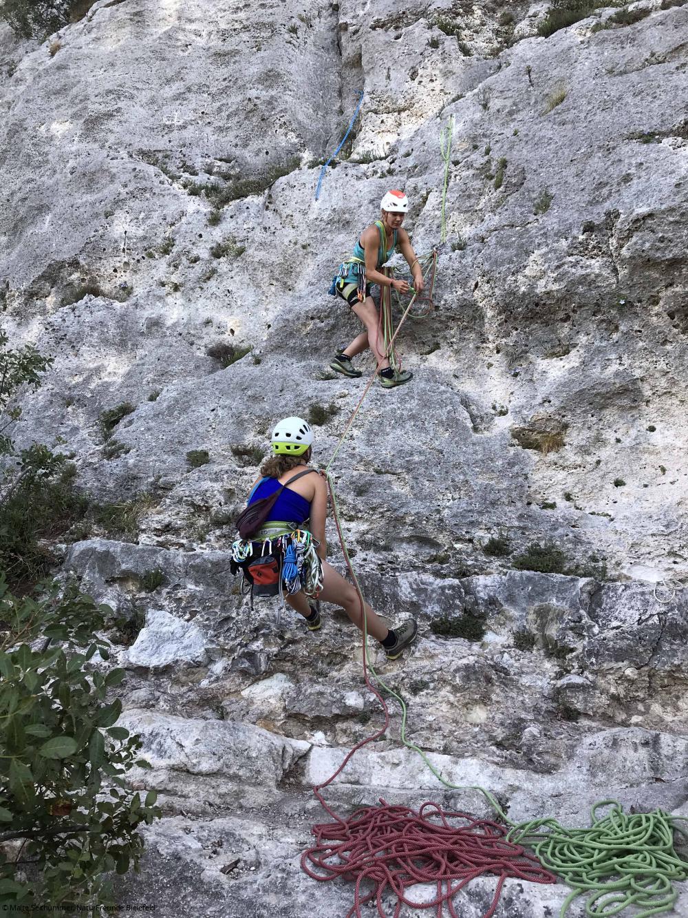 Nun durften Theresa und Magdalena eine Tour komplett vorsteigen und jeweils eine Dreier-Seilschaft durch eine Vier-Seillängentour führen. Anschließend seilten wir über zwei Abseilstände in der Route ab, um wieder zurück zu unseren Rucksäcken am Wandfuß zu gelangen. Alle Kletterer*innen fühlten sich während der gesamten Tour sicher bei unseren beiden Vorsteigenden aufgehoben und es machte Spaß, die beiden Frauen dabei zu erleben, wie sie in ihren Routenführungsrollen aufgehen – den Routenverlauf sowie die Kletterpartner dabei stets im Blick behaltend!